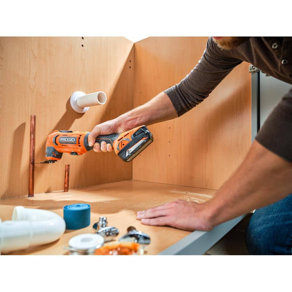 RIDGID présente l'outil multifonction oscillant sans fil 18 V R86241B. Son puissant moteur permet de réaliser des coupes rapides et précises dans les cloisons sèches, le bois, le métal et de manipuler divers autres matériaux de chantier. L'outil multifonction oscillant sans fil RIDGID 18 V offre jusqu'à 20 000 oscillations par minute (OPM) et est contrôlé par un variateur de vitesse facilement accessible, offrant un contrôle optimal pour adapter la vitesse à chaque application. Conçu pour une productivité maximale, cet outil multifonction oscillant 18 V est doté d'un système de changement d'accessoires sans outil et est compatible avec la plupart des accessoires multifonctions. Comme toujours, cet outil multifonction oscillant RIDGID 18 V est 100 % compatible avec toutes les batteries RIDGID 18 V. Mieux encore, cet outil est couvert par le seul contrat de service à vie du secteur. Il suffit de l'enregistrer dans les 90 jours suivant l'achat pour bénéficier des pièces et du service gratuits, à vie. Le R86241K comprend l'outil multifonction oscillant sans fil, le tampon de ponçage, le papier de verre, la lame de coupe affleurante, la batterie de 2,0 Ah, le chargeur et le manuel d'utilisation.