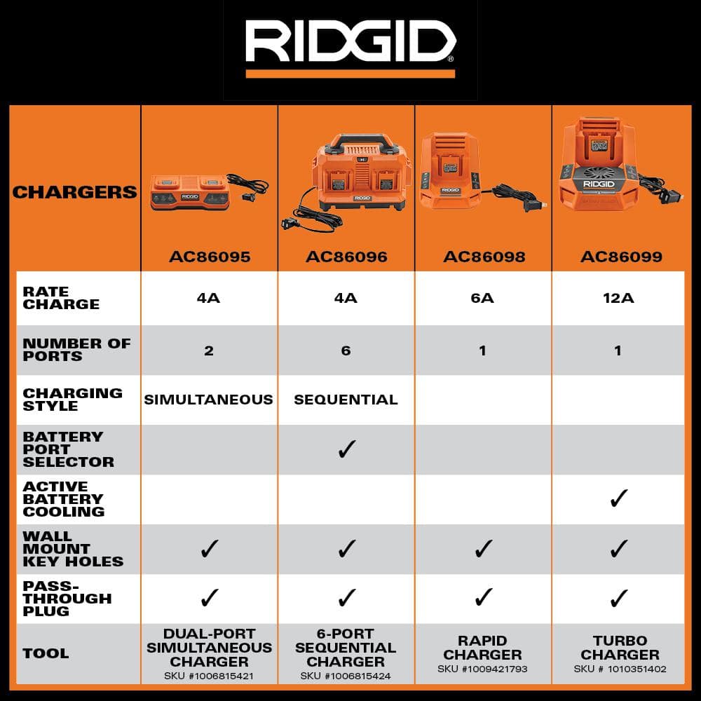RIDGID présente le chargeur turbo AC86099 18 V 12 A, la solution de charge la plus rapide de la plateforme 18 V de RIDGID. Ce chargeur offre une charge jusqu'à 6 fois plus rapide que le chargeur standard R86093 18 V. Optimisé pour les batteries MAX Output EXP, le chargeur turbo RIDGID 18 V 12 A charge une batterie MAX Output EXP 18 V 12 Ah en une heure ou une batterie MAX Output 6 Ah en seulement 30 minutes ! L'électronique intelligente avancée des batteries de plus grande capacité (AC840060, AC840080, AC840120) permet au chargeur d'atteindre cette vitesse de charge élevée. Pour une productivité accrue, ce chargeur est doté d'un refroidissement actif de la batterie grâce à un ventilateur interne qui régule efficacement sa température, minimisant ainsi les temps d'arrêt et garantissant un flux de travail ininterrompu. Le chargeur turbo 18 V 12 A est également équipé d'une prise de courant intégrée pour libérer de l'espace sur la prise. De plus, les utilisateurs peuvent fixer ce chargeur au mur grâce aux fentes en trou de serrure intégrées. Comme toujours, ce chargeur turbo RIDGID 18 V 12 A est 100 % compatible avec toutes les batteries lithium-ion RIDGID 18 V. Mieux encore, ce chargeur bénéficie du meilleur contrat de service à vie du secteur. Inscrivez-vous simplement dans les 90 jours suivant l'achat pour bénéficier des pièces et du service GRATUITS, à vie. Batteries vendues séparément.